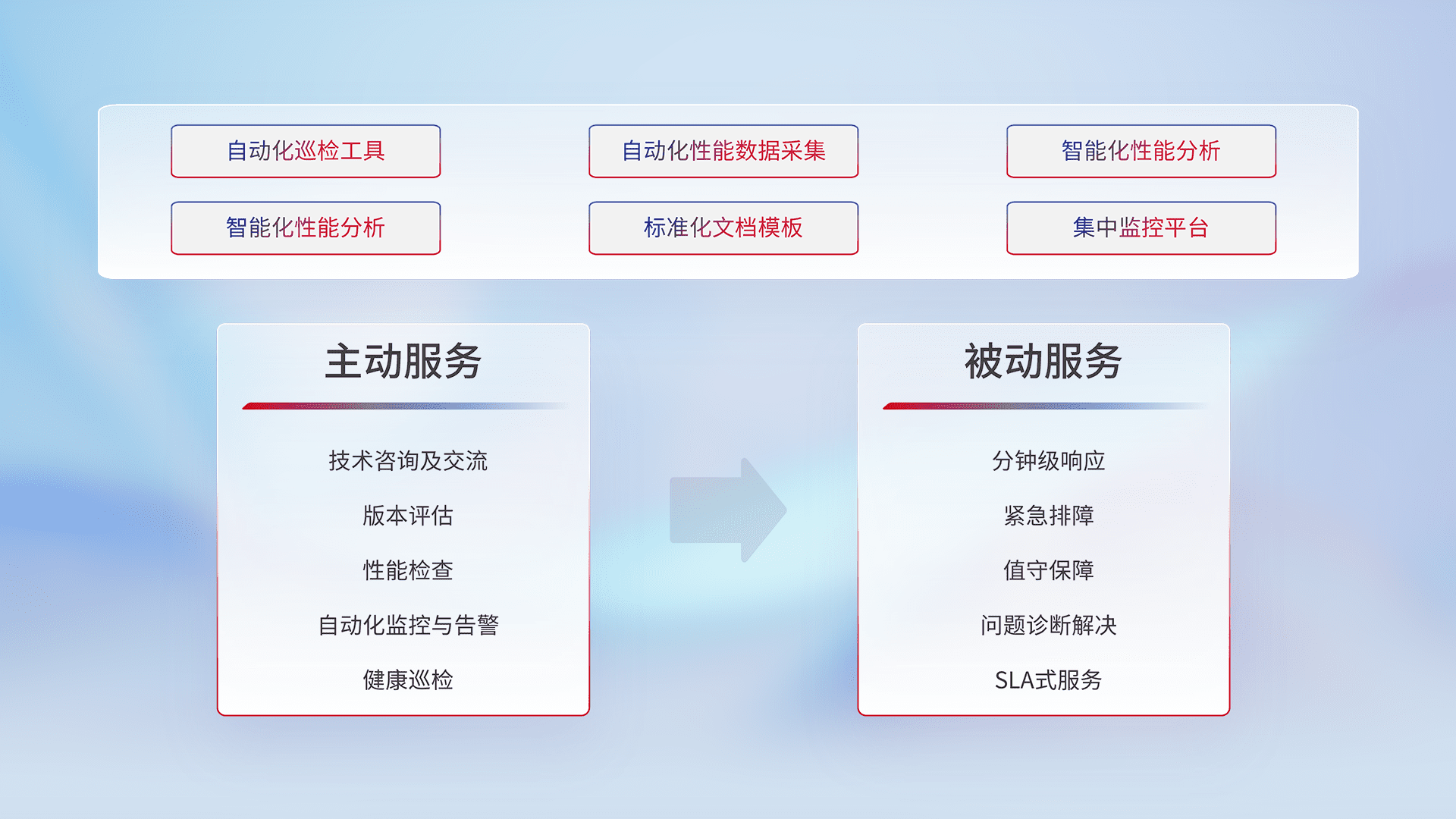 智能化工具和标准化文档,,保障服务质量,,,提供主动服务(包含技术咨询、、版本评估、、、性能检查、、、、自动化监控与告警、、健康巡检)和被动服务包含(分钟级响应、、、紧急排障、、、值守保障、、问题诊断解决、、SLA服务)。。